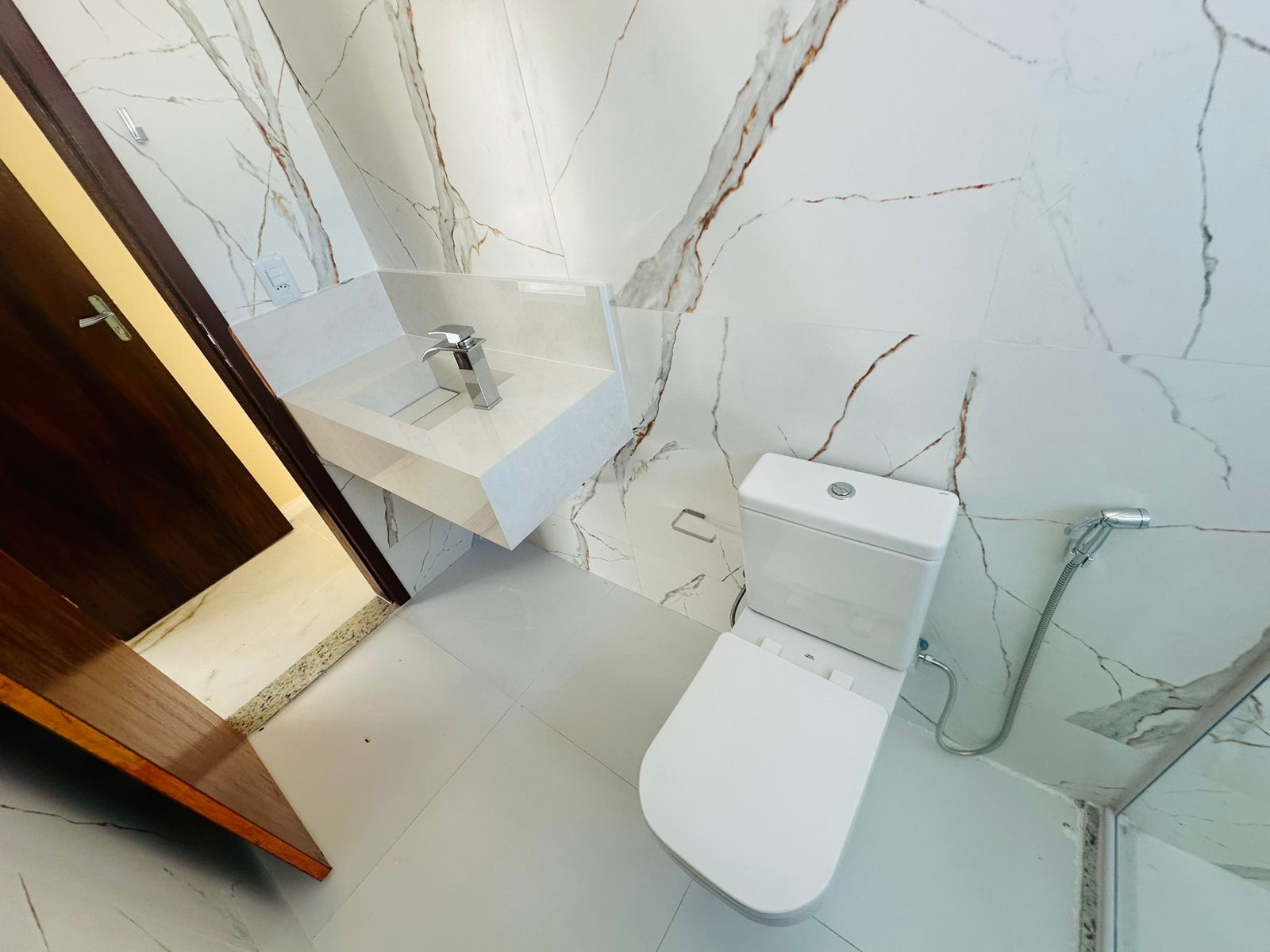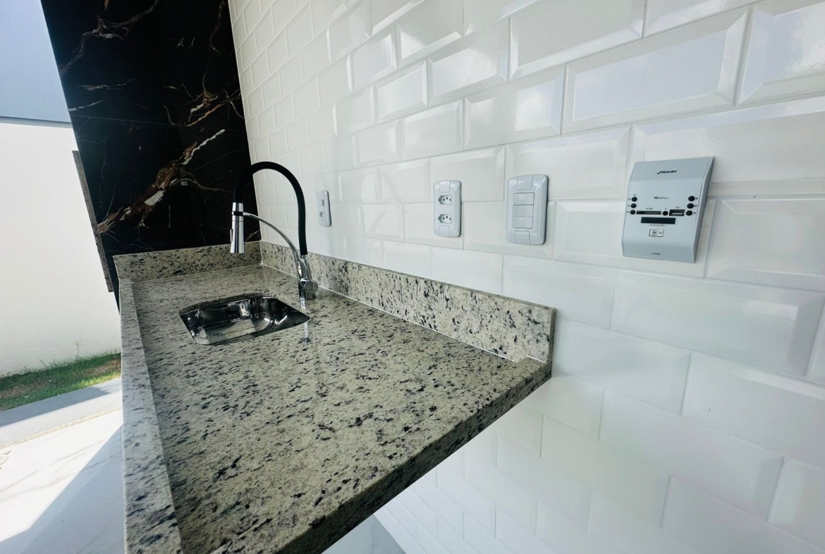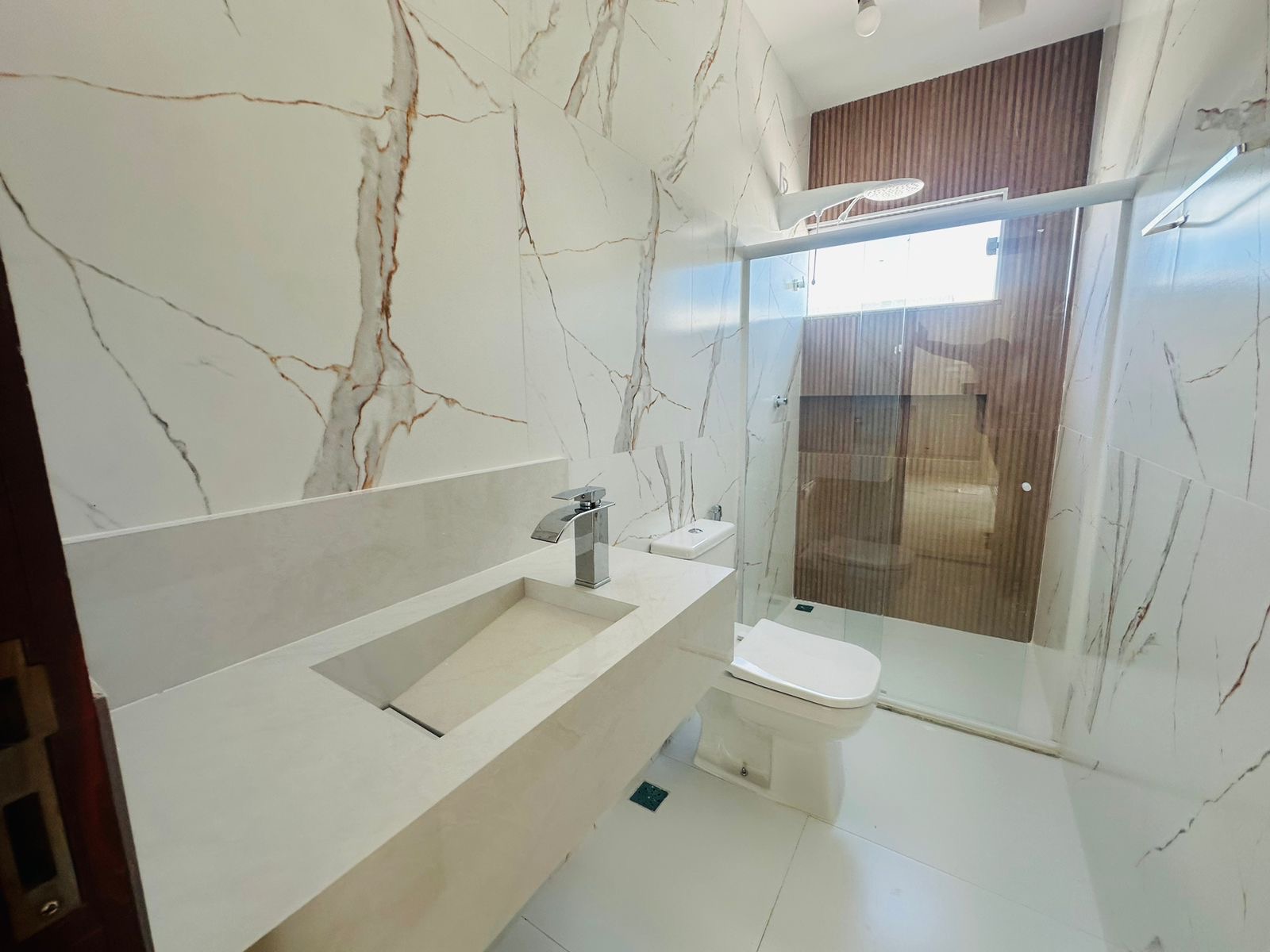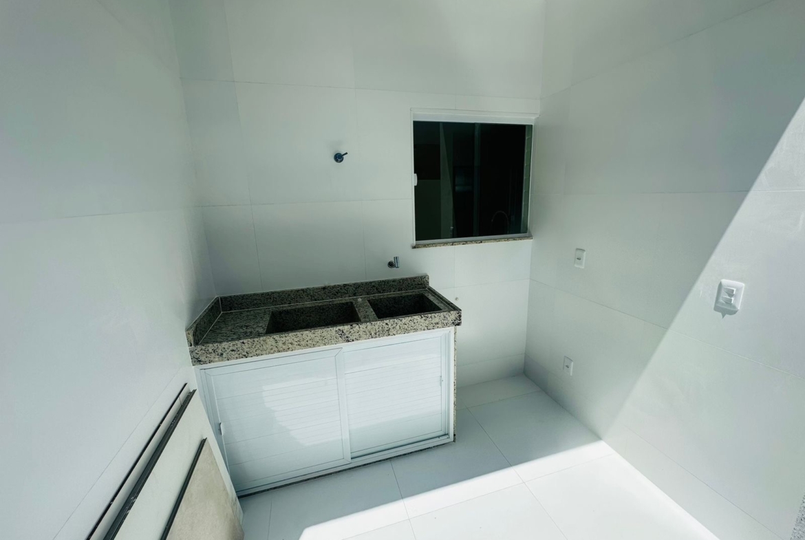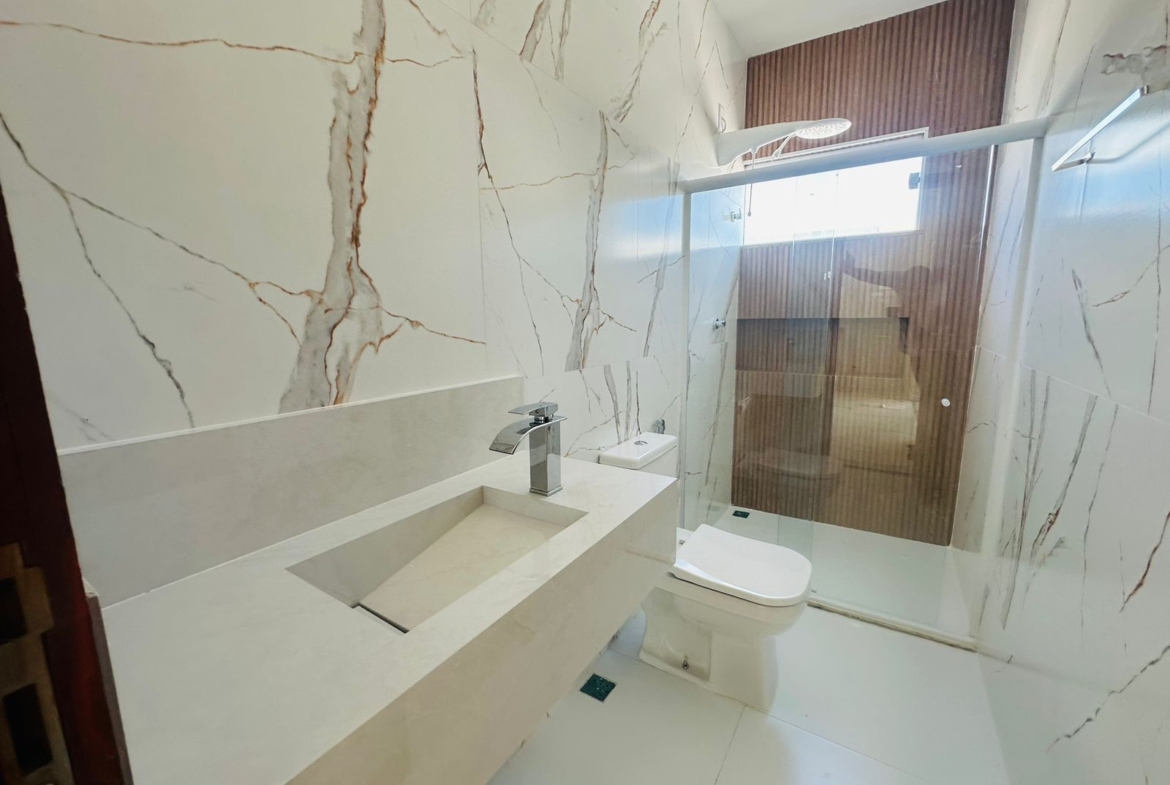 – ⁠Fino acabamento com pias esculpidas, piso em porcelanato, revestimentos em calacata